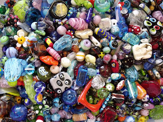 sometimes bad stuff happens, like you keep the bead out of the flame just a few seconds too long or you work on one side of the bead and forget to keep the other side warm and it cracks. sometimes you experiment with new colours and they are uncooperative. sometimes a new design isn’t quite as brilliant as it was in your mind. and sometimes a bead is just too fugly to be allowed out in public. whatever, as a beadmaker you end up with a big pile of wonky, cracked, fugly beads. i cannot throw these out, regardless of how bad they are these are way too many hours of my life. i’ve always thought it would be cool to melt them flat and make a garden bench out of them. somehow. very ancient greek meets sailorgirl. it’s on the project list, along with creating world peace and curing cancer. yes those are my expectations of finishing that list.