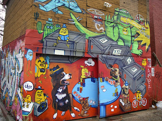 this is the most fun street mural I’ve seen in a long time. Love it!!! Dogs, poker, chickens on bikes!!! Makes me want to pick up a paint brush. Augusta St in Kensington market, Toronto.